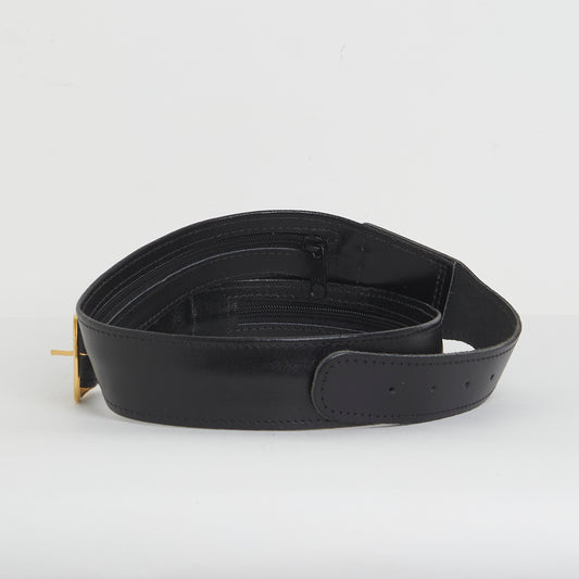 Vintage Black Leather Hidden Zip Money Belt with Gold Buckle