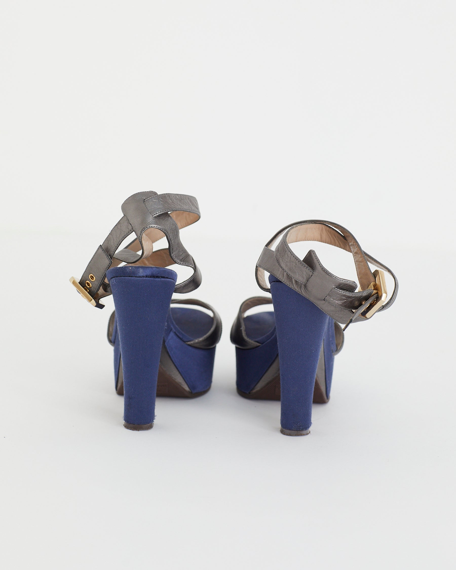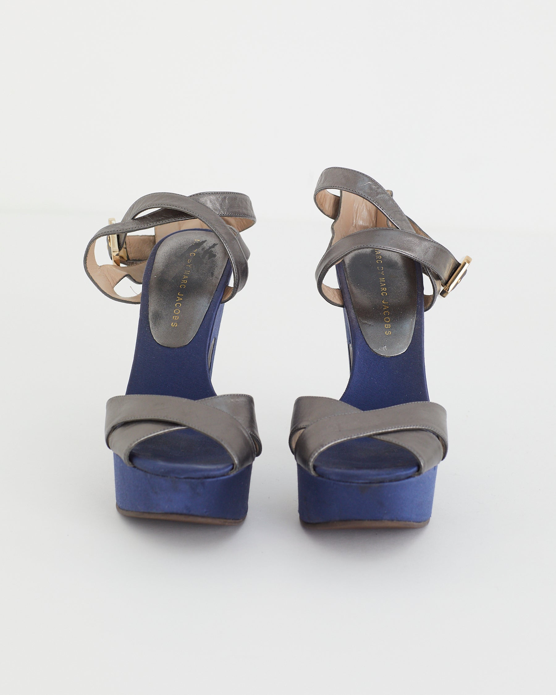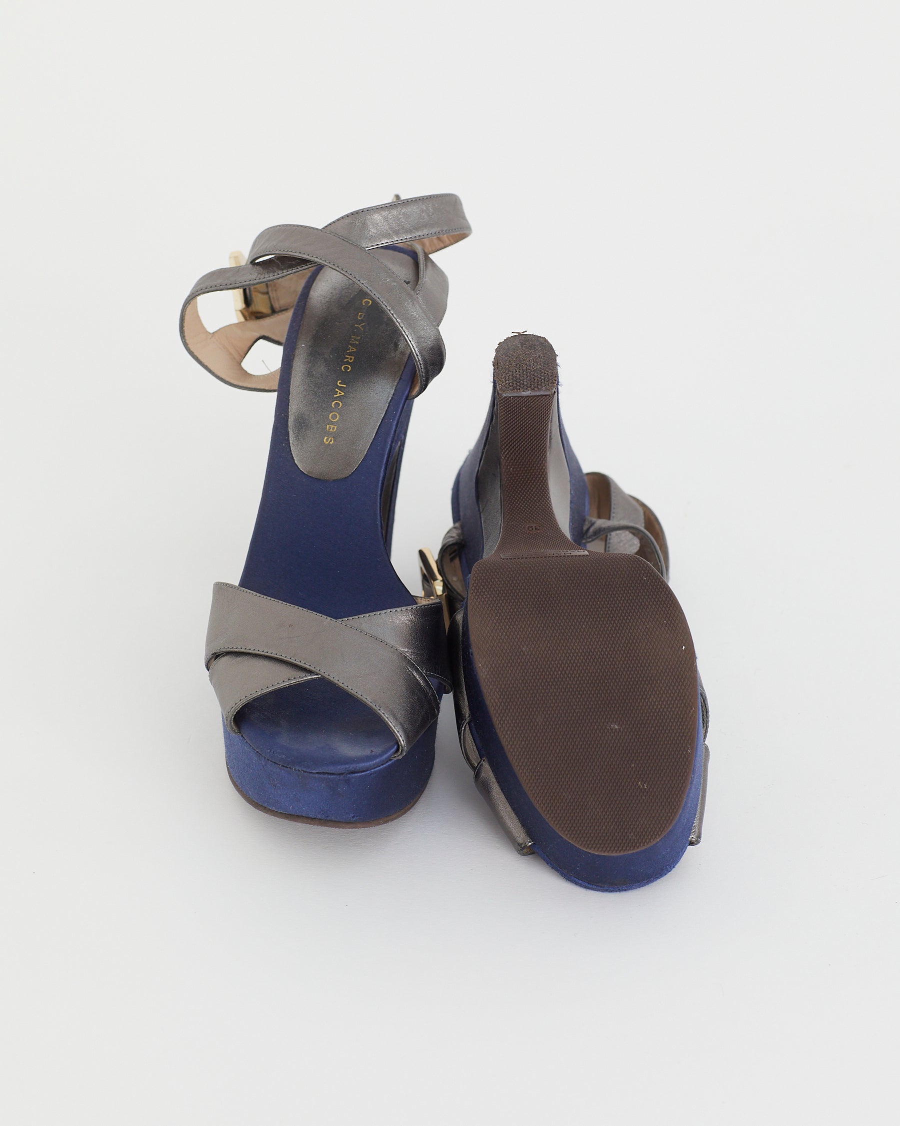 Vintage Y2K Marc by Marc Jacobs Heels in dark blue satin and gunmetal leather with ankle strap and gold buckle detail Very little wear.