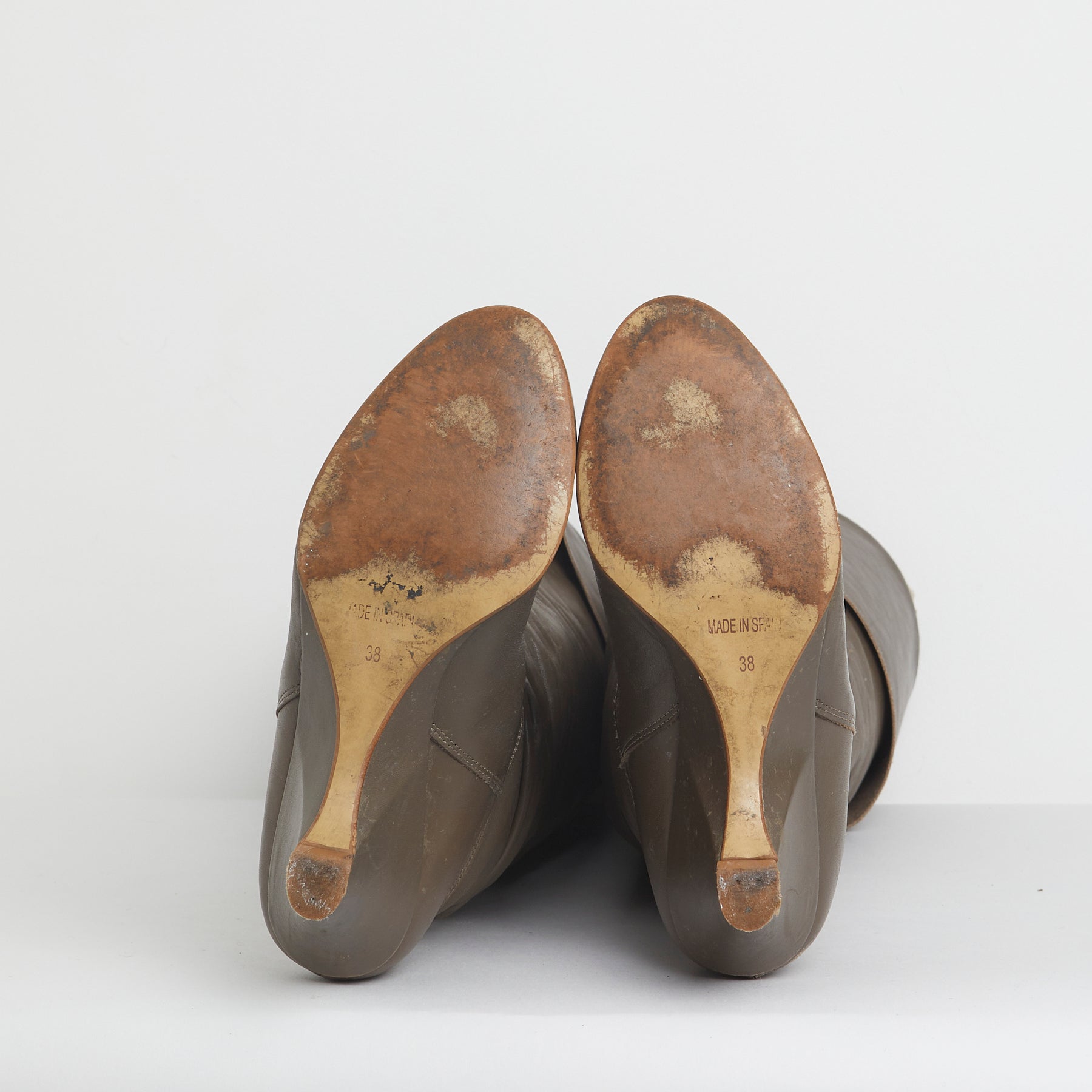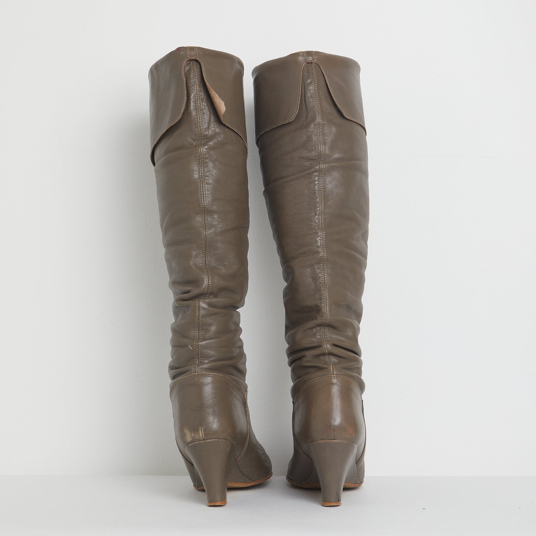 Y2K Taupe Leather slouch boots will roll down top that can be worn over or below knee
